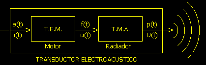 Tenemos una señal de audio en forma de señal eléctrica (corriente, voltaje...). Esta energía es transformada en energía mecánica en el transductor electromecánico, ahora se miden las magnitudes fuerza y velocidad: f(t), u(t). Tras pasar por el transductor mecánico-acústico, se pasa a hablar de energía acústica, con las magnitudes presión y caudal: p(t), U(t).