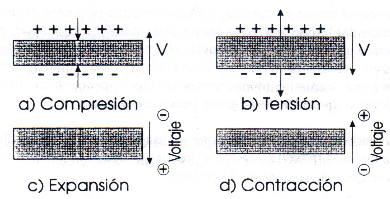 Supongamos que un material, de los citados anteriormente, es cortado en forma de disco o de prisma (slaab), con un par de superficies planas en oposición y orientada perpendicularmente con un eje del cristal. Si ponemos dos electrodos, uno en cada cara al producir una compresión del cristal se inducen cargas sobre los electrodos y, de forma inversa, al crear una diferencia de potencial entre los electrodos se produce una compresión o una dilatación del material, (se muestra en la figura). El mismo efecto se produciría por el deslizamiento de las caras, si lo hiciéramos con relación al eje Y.